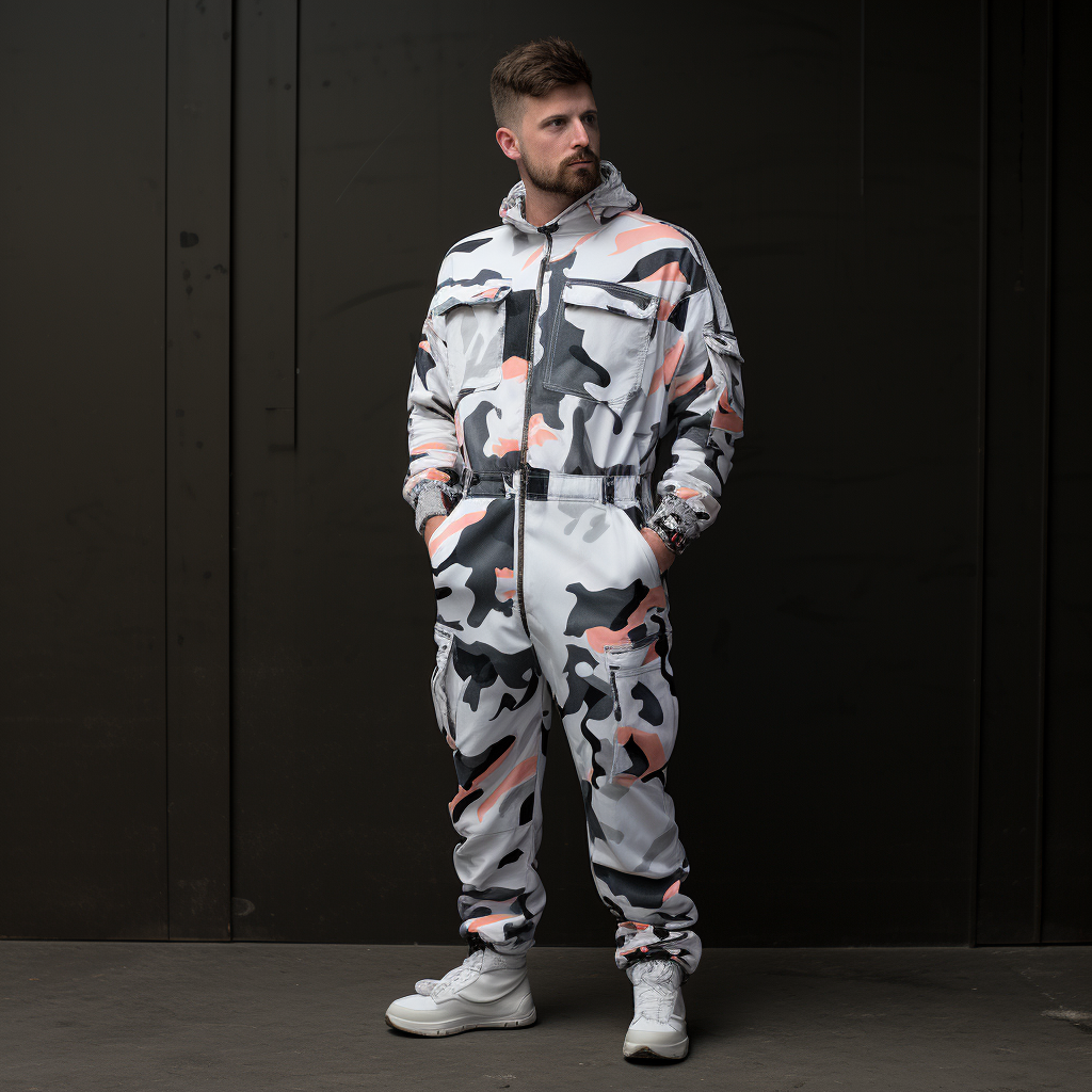 Stalk the streets of Shoreditch, where the concrete is our catwalk and the graffiti our gallery, we find the latest enigma wrapped in the ensembles of the elite. Here stands our sartorial soldier, a maverick in monochrome mixed with the molten lava of city sunsets, clad head-to-toe in the camo of the new age.